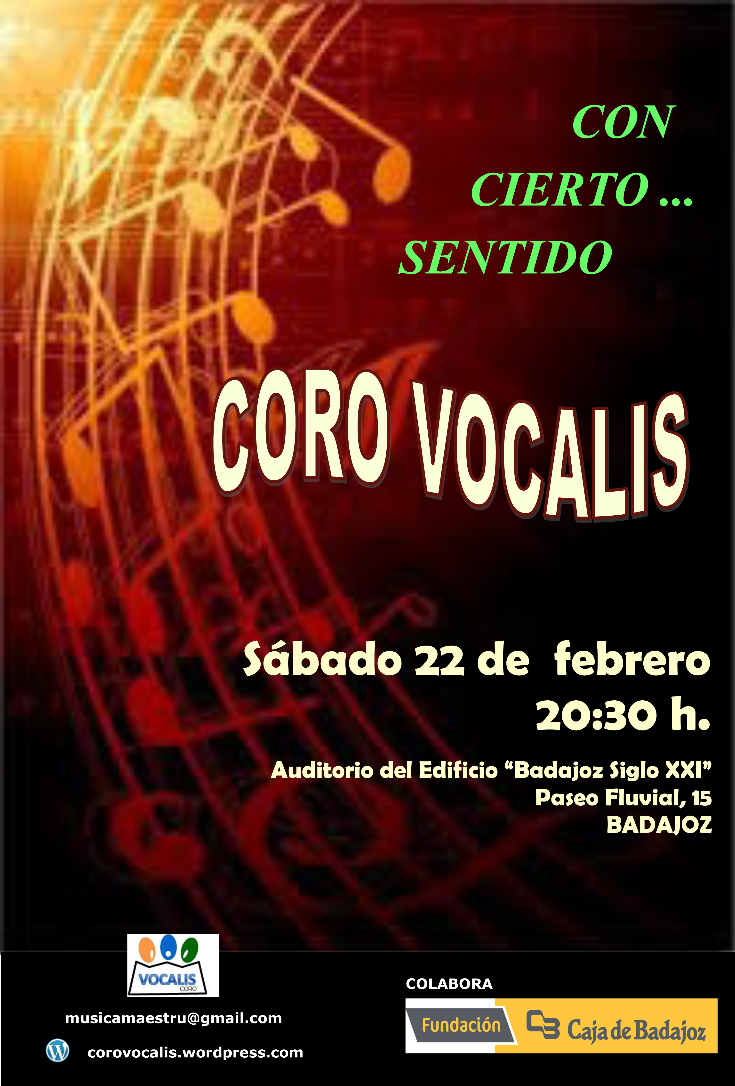 Esta semana, el Coro Vocalis vuelve a subir al escenario en Badajoz para ofrecer un nuevo concierto, que en esta ocasión se celebrará en el auditorio del Edificio Siglo XXI de Caja de Badajoz. Tendrá lugar el sábado 22 a las 20:30 horas y la entrada es libre. Nuevamente, contaremos con un repertorio que combinará la música a capela con varias piezas con acompañamiento de piano. Para más información, podéis ver aquí el programa del concierto. También tenéis más detalles en el cartel que os mostramos a continuación.