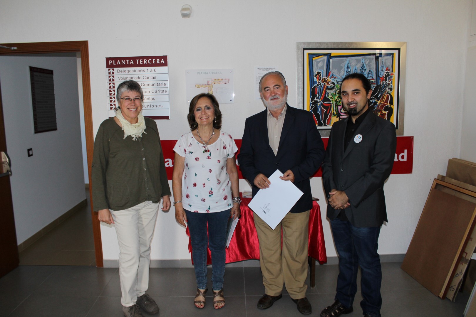 (De izquierda a derecha, Pepa Font, miembro del coro, Pilar Llorente, tesorera, Juan Santiago, Director de Cáritas, Moisés García, Director del Coro Vocalis)